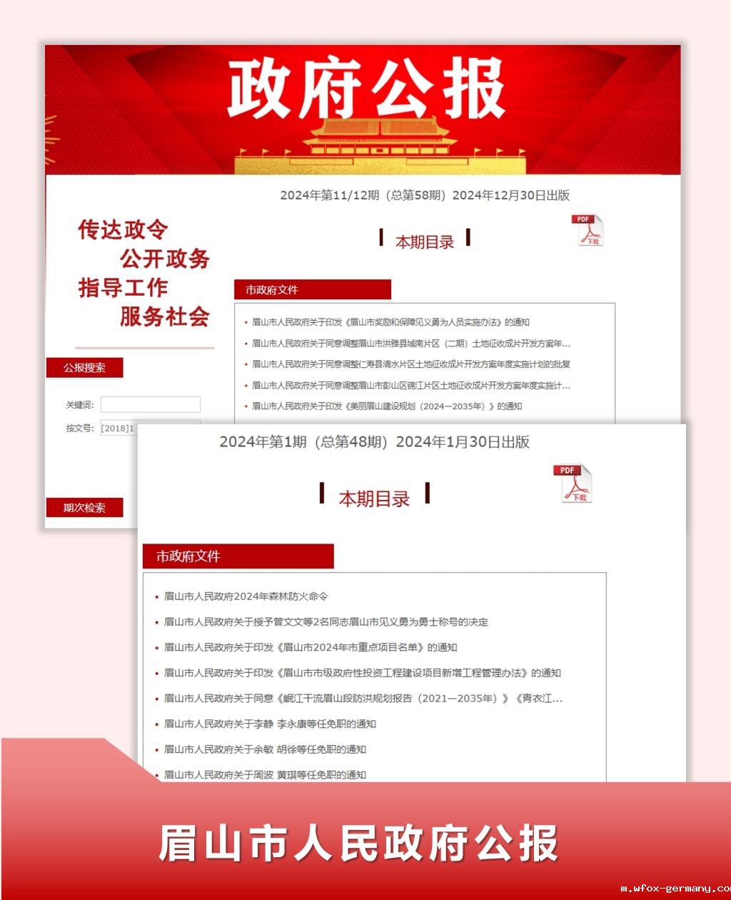 持续办好政府公报,全年共出刊12期,刊登文件74件,向市级部门、县(区)、园(新)区、乡镇(街道)和村(社区)赠阅1.65万册,并通过政府网站和“眉山发布”微信公众号为社会公众提供便捷的查阅服务。规范管理政策文件库,组织开展行政规范性文件清理工作,动态更新有效性标识,各级行政机关集中公开现行有效市政府规章2部、行政规范性文件524件,并提供查询、下载等服务。